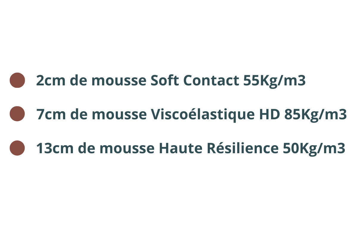 | Composition (du haut vers le bas) | - 6cm (3+3) de mousse de confort aérée Sanimatex HD35 35kg/m3 - 12cm de mousse latex Sanimatex LHQ72 densité 62kg/m3 - coutil amovible et lavable 4cm (2cm+2cm) |
